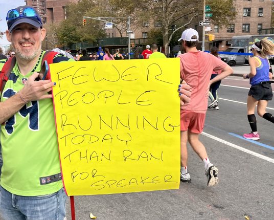 Överraskande få politiska budskap utmed banan i år, men nästa år kommer det se helt annorlunda ut eftersom valdagen inträffar bara två dagar efter New York City Marathon. För er som funderar på att springa loppet nästa år så är en stark rekommendation att ni stannar ända till onsdag så att ni får uppleva stämningen under valdagen i USA. På Times Square samlas horder av människor för valvaka.