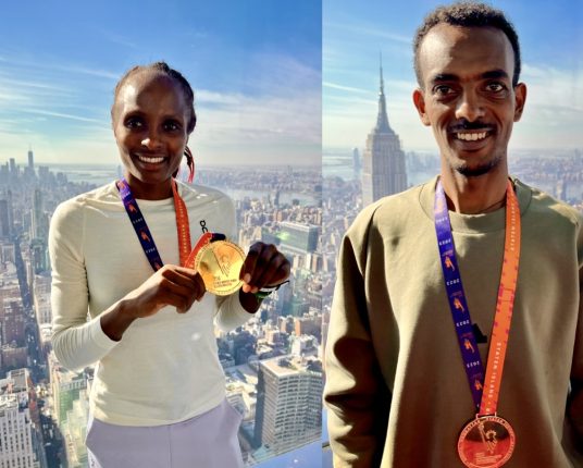 Vänster: För många är New York City Marathon ett upplevelselopp, men det finns vissa som har lite mer bråttom till mållinjen som exempelvis damsegraren Hellen Obiri och herrsegraren Tamirat Tola. Höger: Segrarna i rullstolsklassen, de som för övrigt har dominerat sporten i år, Catherine Debrunner och Marcel Hug från Schweiz.