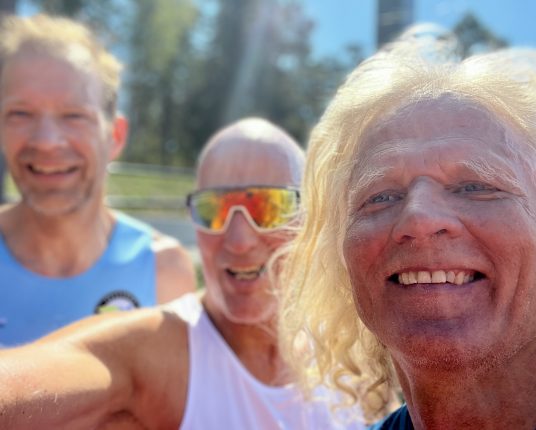 Vi är tre som kommer till start på distansen, den tredje är Patrick Pring som tävlar för Tullinge FI och i klass M55 och är riktigt snabb, säger Roger. Men vad gör väl det, vi blir till slut alla tre vinnare den här dagen i respektive klass. Nu var ju inte motståndet direkt överväldigande (för att dra till med en beskrivning i absolut underkant) men som Ingvar Lindqvist, 85, IFK Lidingö (som tog guld i spjut och slägga) så träffande uttrycker det i omklädningsrummet efteråt, ”man måste ju deltaga för att kunna vinna”.