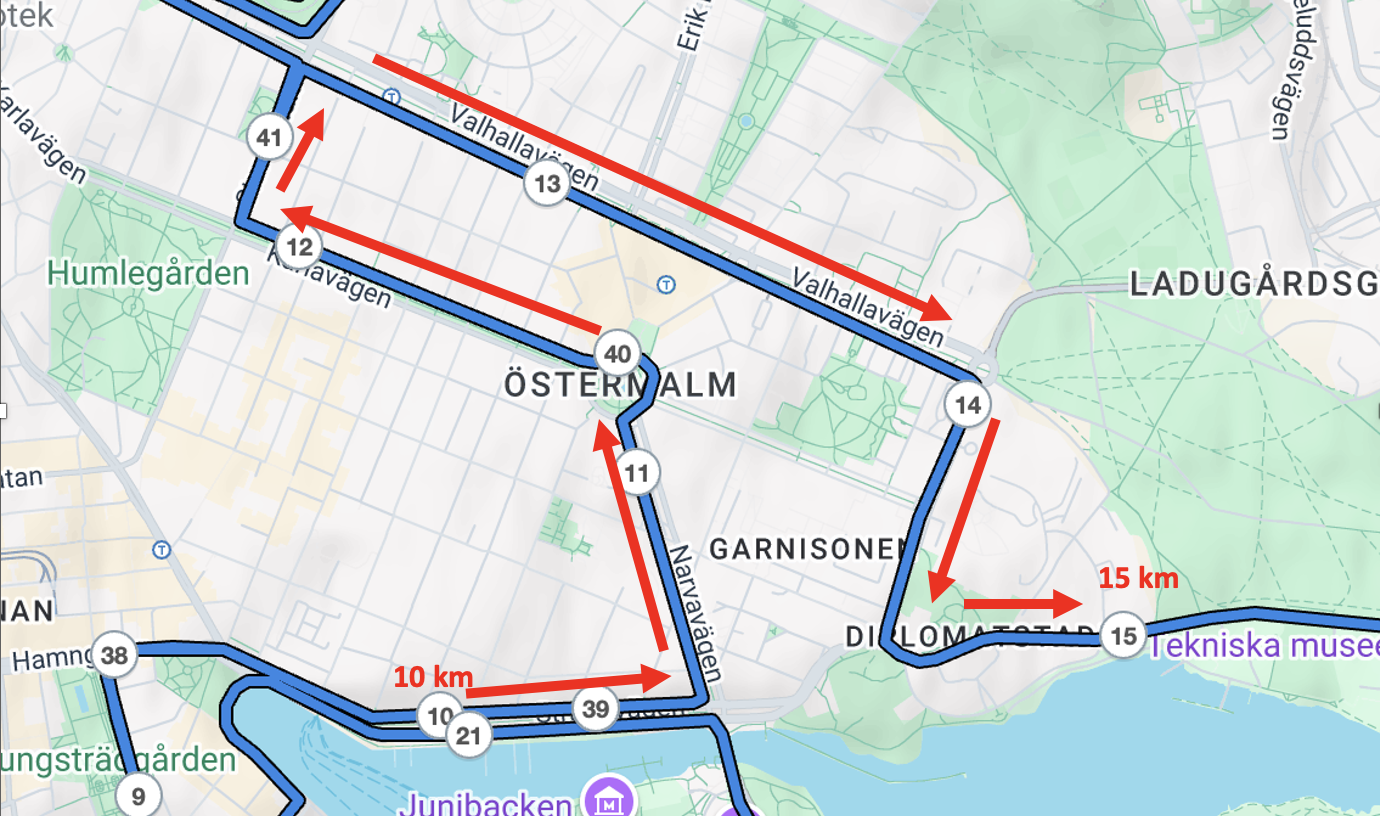 Här tycker jag att man ska ta det lite lugnare uppför, och detsamma gäller motlutet på Sturegatan upp mot Valhallavägen. Det man tappat i snittfart uppför dessa motlut smyger man in igen då Valhallavägen är svagt sluttande utför. Så även om inledningen på Oxenstiernsgatan vid Radiohuset går svagt uppför, kan man flyta på i utförslutet ner mot Diplomatstaden och Dag Hammarskjölds väg. Det gör att man säkert kan hålla den planerade snittfart på detta 5-kilometersavsnitt utifrån tidsmål.