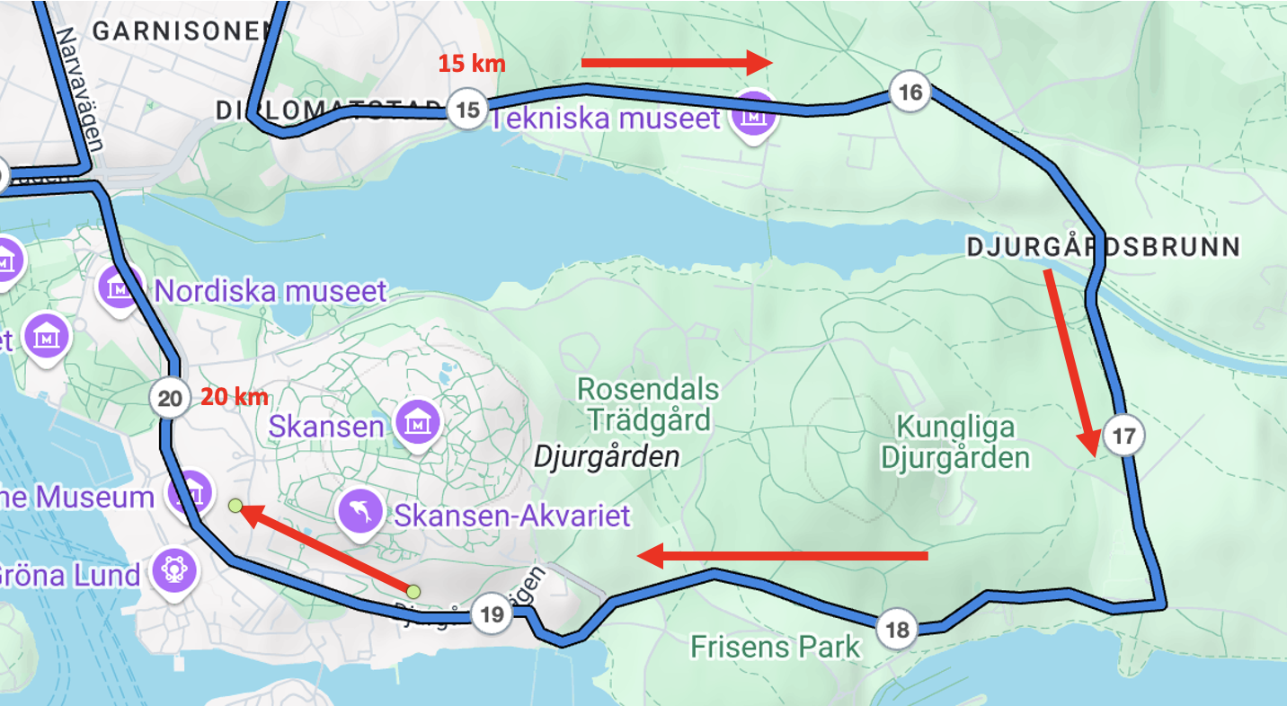 15–20 km: Böljande på Djurgården