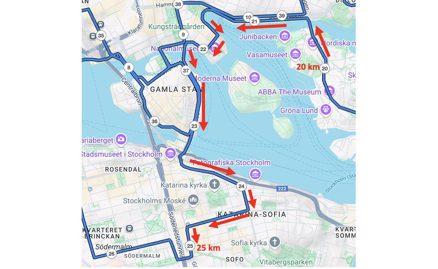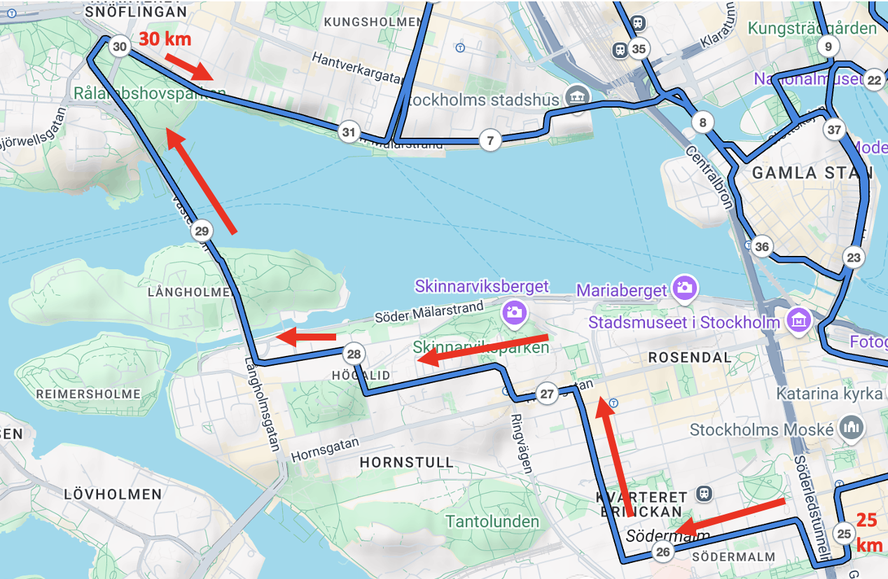 25–30 km: Omväxlande på Söder med högsta punkten och klassiska Västerbron