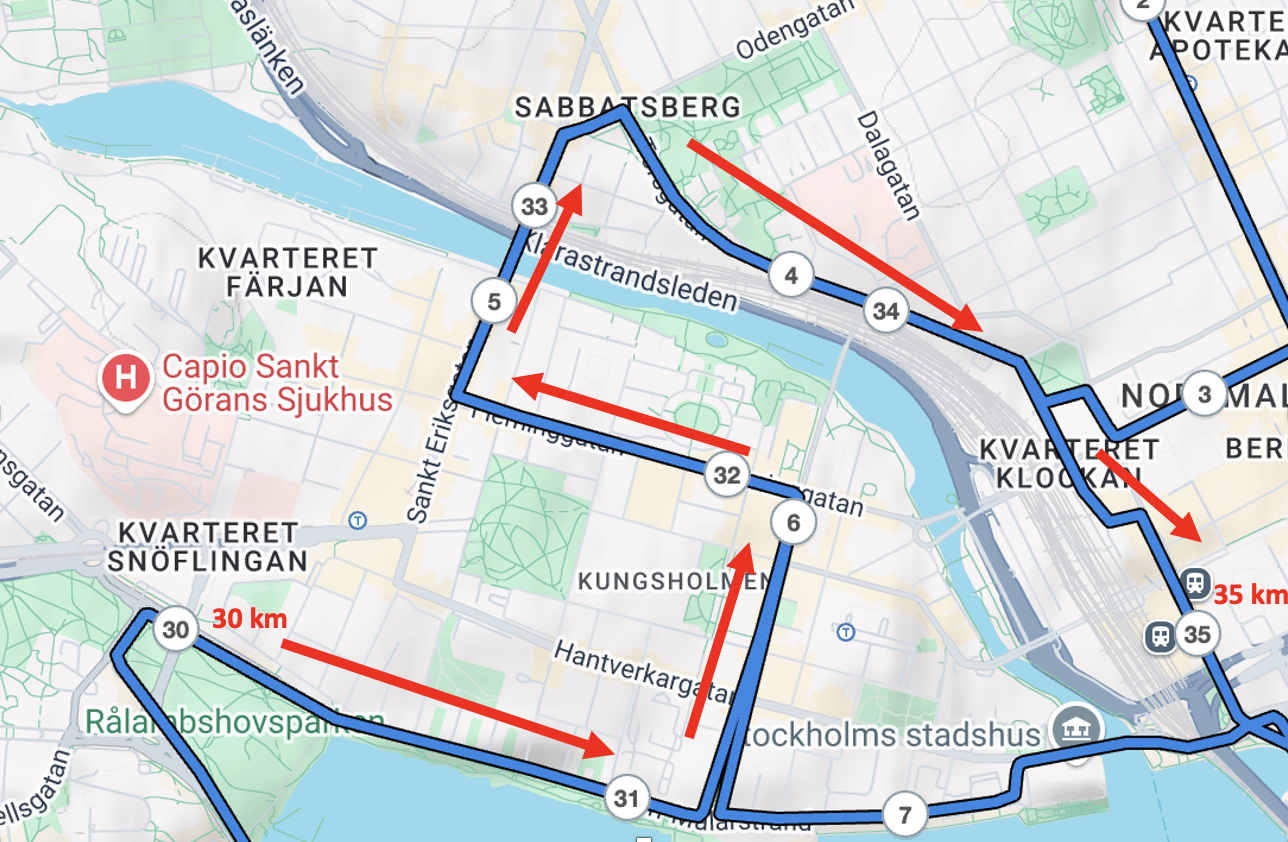 Som enskild 5-kilometersdel är 30-35 kilometer relativt lätt. Men i fjol upplevde jag den i ett skede av loppet där jag var trött,och då är exempelvis lutningen uppför från Norr Mälarstrand tuff. Tänk därför på att det sedan går utför på Torsgatan och att du vid Centralen ”bara” har sista 7 kilometerna kvar.