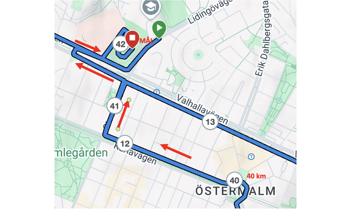 Karlavägens flacka, fina sträcka tar oss vidare mot Stadion och målet. Efter det sista, korta motlutet uppför Sturegatan är jag och många med mig vana vid att man direkt ska svänga runt och springa in på Stadion från Sofiavägen. Men sedan i fjol får vi inte göra det. För att samla ihop den totala sträckan på 42 195 meter springer vi i stället först Valhallavägen vänster och rundar Valhallagrillen innan vi vänder tillbaka mot Stadion och tar in på Sofiavägen.